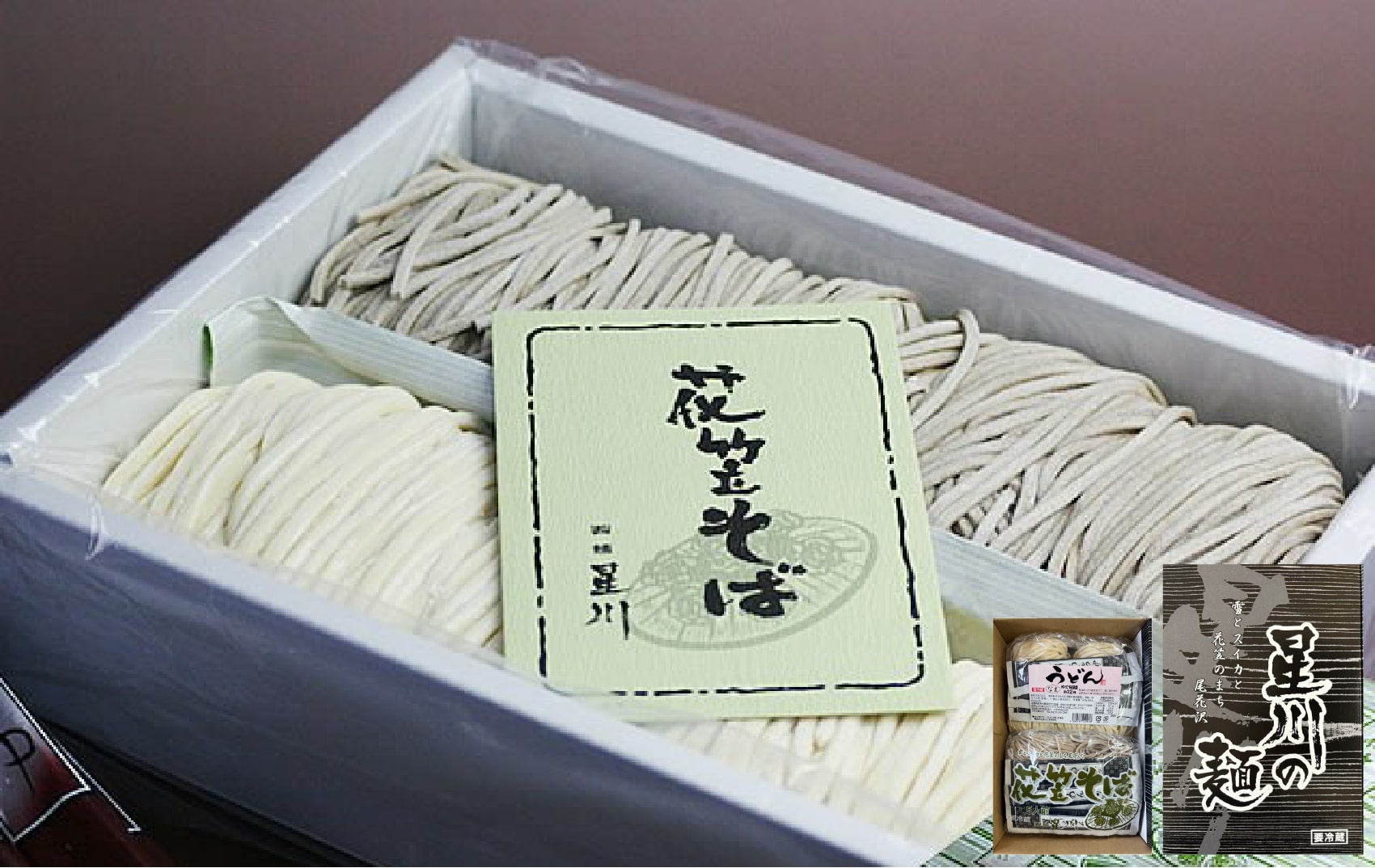 化粧箱の詰合せギフト。看板商品の花笠蕎麦(田舎蕎麦)とコシの強さと滑らかさが好評のうどんを詰合せたギフトセットです。