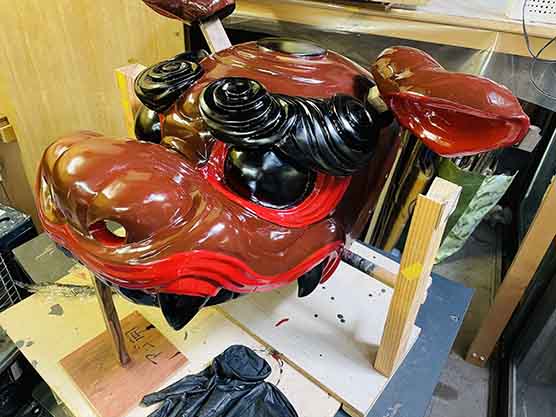 新作の2頭と大獅子の金箔調の塗装を仕上げている。