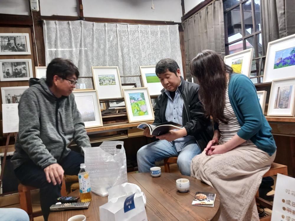 米屋さんの写真展には、「米屋さんの作品を見たくて」「米屋さんのファンです」と、たくさんの方がおいでになりました。そうした中で、写真のような光景が見られるようになりました。憧れの作家とお茶を飲みながら、撮影のポイントを尋ねたり、著書の感想を伝える。