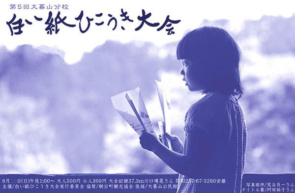 写真は荒谷良一さんが2回大会の時に撮影なさったものです。これ一枚で白い紙ひこうき大会の全てを物語っているような気がして第5回大会ポスターに使用させていただきました。荒谷さんは全国の木造校舎等あたたかな懐かしい写真を数多く撮られているプロの写真家です。実は、インターネットで木造校舎写真を検索した時に、荒谷さんの