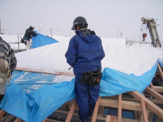 外壁面にきれいにブルーシートを貼って横からの雪対策も万全です。