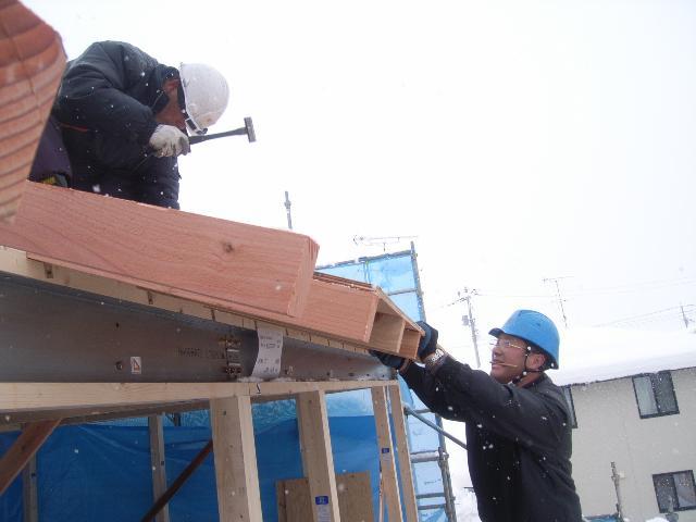 昨日、雪の為施工できなかった軒先の合板を貼っております。
