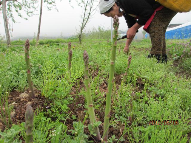 オババの毎朝のお仕事、アスパラ採り。今が旬!草むしりをしながら付け根からナイフで切り取ります。