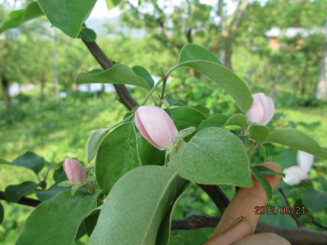 蕾のときはごらんのように、美しいピンク色ですが、咲くと花びらは白くなります。他の果樹の花が終わりましたが、今がかりんの花のとき、ほっこりする花です。