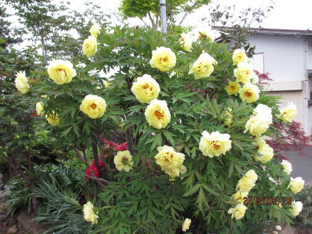 植木祭りでかった牡丹の木、30年ぐらい前に植えました。金茶色の牡丹、今年は100個ぐらい花を咲かせて見事です。香もステキ。