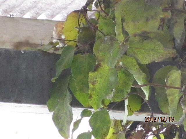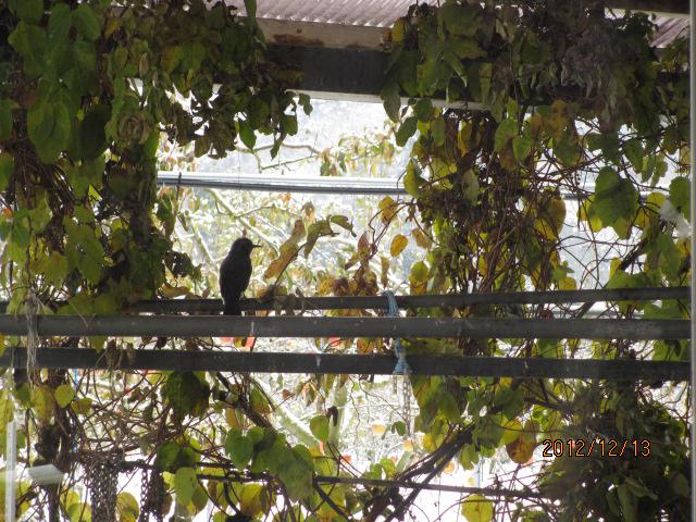 あたり一面の雪なので、わずかに残った葉っぱに野鳥が集まってきました。事務所の戸の前を中から写真を撮りました。