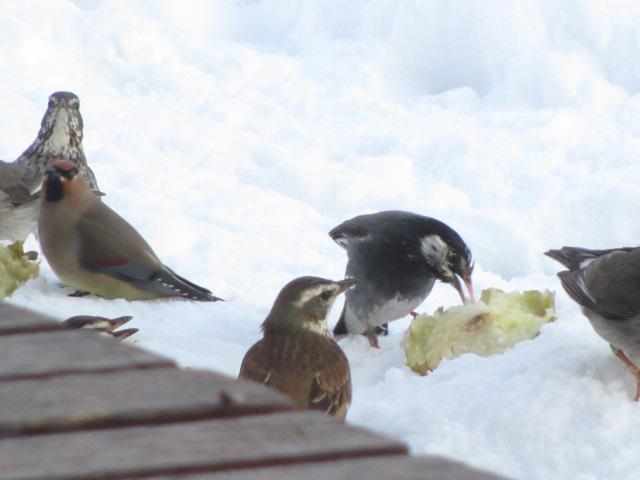 ヒレンジャク1羽、黒っぽいのがムクドリ、真ん中の茶色がツグミ、ヒレンジャクの後ろもツグミ。