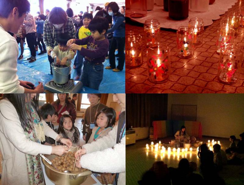 3月10日(日)、NPO法人アクアゆめクラブ様と鈴木喜久栄様ご家族のご協力で、大勢の皆さんがお集り下さいました。あいにく強風のため、予定していた外での点灯会はできませんでしたが、製作会場で少しだけ灯させていただきました。蜜蝋の優しい灯りのもと、川村かなえさんのクリスタルボウルや、ただのなおみさんのオルガリートの演奏を楽しみました。新野知章さんは、支援している桂島をうたったオリジナル曲を披露下さり、最後には「花は咲く」を参加者全員で合唱しました。調理室で準備していた「力玉こんにゃく」も大好評でした。ご参加ありがとうございました。