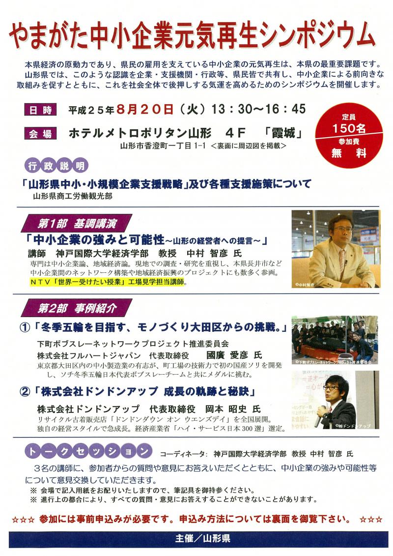 本県経済の原動力であり、県民の雇用を支えている中小企業の元気再生は、本県の最重要課題です。山形県では、このような認識を企業・支援機関・行政等、県民皆で共有し、中小企業による前向きな取り組みを促すとともに、これを社会全体で後押しする気運を高めるためのシンポジウムを開催します。