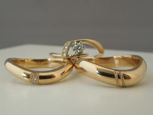 柔らかい線を描くゴールドを基調とした、3つで1つのリング。