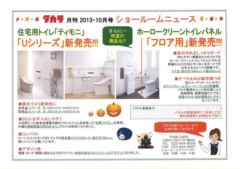 山形は朝晩寒くなってきましたよね〜(;_;)連休中遊び過ぎたせいか、私も風邪をひきました・・・(笑)お医者さんから薬をもらい、ようやく治ってきたところです ^^;みなさんも季節の変わり目には十分ご注意くださいね (´;ω;`) さて今回は、「タカラ」さんから10月号★ショールームニュースが入ってきました〜♪トイレ関係の新商品ですね!今のトイレは、昔のトイレに比べて相当節水できているようです。 トイレと共に紹介されているのが、「トイレパネル」! ホーローとは ガラス質の清潔さと、金属の強さを兼ね備えた素材 トイレパネルの特長は ニオイの原因となるアンモニア成分などが染み込まない。 汚れてもサッとひと拭き。 湿気にも強く、傷まない。 トイレ廻りもこれで清潔!簡単に汚れを拭き取れるのでお掃除もラクラク ♪ この商品を詳しく知りたい!という方は、タカラショールームまで足をお運び下さい。 ▼ 参考HP ▼http://www.takara-standard.co.jp/product/toilet/horo_panel.html