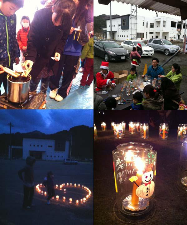 作ったあとはセロハンにイラストやメッセージを描いて点灯用に準備し、残って下さった皆さんで、たくさんの方が亡くなられた防災センターのそばで灯しました。ご家族を亡くされた方には、きっとつらいクリスマスになるのでしょう。心からご冥福を祈りました。