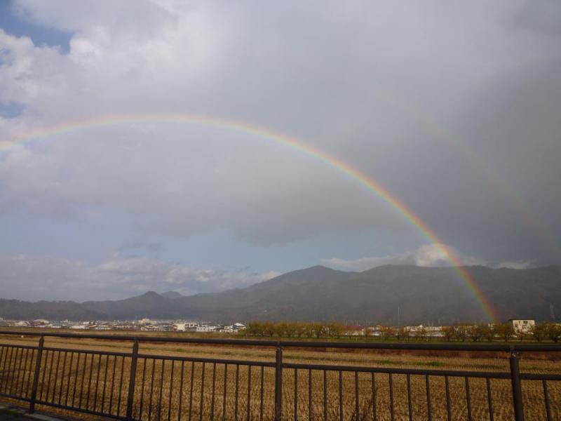 村山からの帰りに、東の空に綺麗な虹がくっきりと浮かび上がりました。それも二重なんです。私たちをお見送りしてくれたのかな。