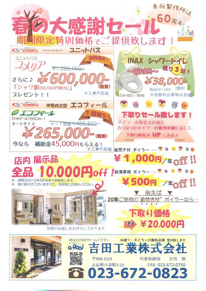 日頃より当店をご利用いただきありがとうございます!   2月も半ばを過ぎ、、仙台にショッピングへ行くと、マネキンさんがすでに春物を着ていたり・・♪そういうのを見ていると、 春、春、春ーー!!!春まだかなーーーーー!!!!と大声で叫びたくなります (*´∀`*)  もう雪はいらないですよね!春がいいですよね〜♪   ということで (・∀・)ツイッターにも以前につぶやきましたが、春のちらしが完成しました!!   ででーんっ!!その名も「春の大感謝セール」です(`・ω・´)♪   前回の、冬セールで好評だった品物が引続きお買い得だったり  なんと!!!3月末までは、店内展示品が 全品¥10,000円 OFF!! なので広告には店内の写真を載せてみました♪ なお、他のセール品、10,000円未満の商品に関しましては割引対象外 とさせていただきますので予めご了承ください。 展示品には数に限りがありますので、お早目にご検討ください ヽ(´▽`)/ 他にもお買得商品もりだくさんの春セールをお見逃しなく!!(^O^)