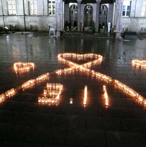 協力させていただいた3.11キャンドルナイト「追悼・復興への祈り」は、吹雪の中にも関わらず、大勢の方に参加いただきました。(およそ400人)皆さん、寒さで手や鼻を赤くし、雪で頭を白くしながらも一重一重に思いをこめて糸を蜜蝋に浸して作って下さいました。おかげさまで3.11とハートリボンの火文字を完成させることができました。きっと空の上に祈りは届いたことでしょう。
