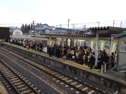 この写真は、昨日夕方、羽前小松駅の2番ホームで6時9分発米沢行きの列車を待つみなさん。この日は井上ひさしさんを偲ぶ吉里吉里忌、前日は生活者大学校があり、延べ1000人以上の皆さんが川西町を訪れてくださいました。特に、19日(日)の午後は、浅田次郎さんの講演に、平田オリザさんや永井愛さんのトークショーもあり、MCの古屋和雄元NHKアナウンサーの人気も幸いして、710余席のフレンドリープラザに立ち見も出る800名の入場者だったとか。私たちは、まちなか巡りなどのオプショナルがあった午前から、会場になったフレンドリープラザのフードコートでまちカフェ「こまつ屋」を開店。メインメニューの芋煮や牛串、ソフトクリームには長蛇の列。いやはや、いまさらながら、井上ひさしさんのパワーのすごさを感じた1日でした。
