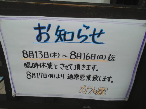 ●<カフェ蔵>臨時休業のお知らせ 8月13日(木)〜16(日/定休日)