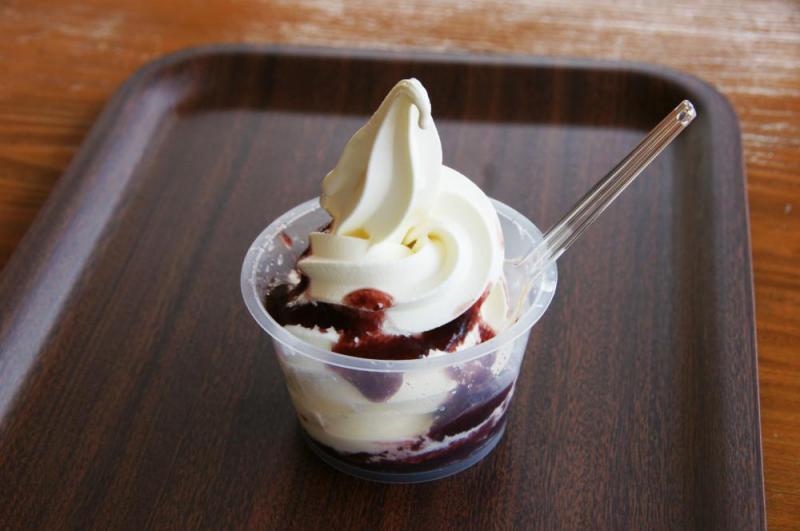 お盆を過ぎた頃から人気があるソフトクリームをご紹介します。特製フルーツソースをトッピングした個性豊かなソフトクリームです。ラ・フランスとブラックベリーの2種類があります。写真はブラックベリーソフト各種350円(税込)。