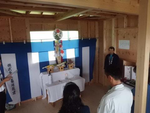 無事に棟木も上がり、本日めでたく、M様邸の上棟式を迎える事ができました。式も滞りなく進み、最後に参加者全員で乾杯をいたしました。季節はまだ暑い日が続いておりますが、体調管理には十分気をつけて工事を進めてまいります。