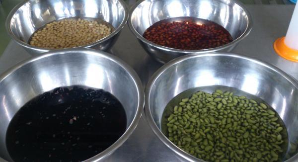 左の写真は、4つの大豆を水に浸したもの。〇〇時間で色素が水に抜け出てきました。でも、それぞれの種類で量や時間経過にバラツキがあります。もちろん、柔らかさにも差が出ます。これを〇〇時間煮て、煮汁を山形大学工学部に持ち込みました。ご存知、豆ガールズの「豆からの宝探し」は続きます。農業高校生のPLAN、DO、CHECK、ACTIONは宝の山を探しあてることが出来るでしょうか?乞う、ご期待です。あっ、忘れてました。今回3年生が試作した「紅大豆塩ジャム」が評判抜群です。