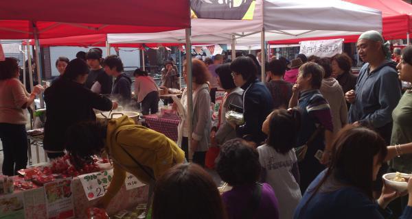 久しぶりの高円寺「座の市」には、めでたく出産を終えたMさんや、今回が初めてのYさんもスタッフとして参加し、期待と不安の中でスタートしました。今回のメニューは、米沢牛いり芋煮、同じく米沢牛牛串、玉こん、ラ・フランス、庄内柿、スイーツトマトなど山形の名物づくしで品ぞろえをしました。始めはチョロチョロでしたが、昼食時間頃から一気に来店者が増え、2時ごろまで切れ目なくお出でいただきました。前回9月の芋煮が一鍋で終了し、1時間くらいしかもたなかったので、今回は二鍋準備しましたが、コンロと鍋を二つ準備するのを忘れ、結局、お客様にお待ちいただくことになってしまいました。12時半過ぎに「二鍋目の準備できましたーっ!」の声をかけると、一気に集まったお客様の写真がこれ!「美味しかった!」の声をたくさんいただいた、芋煮、牛串、玉こん3点セットは1月も準備いたしますので、是非お出でくださいね。また、折角遠いところから来ていただいた方や、ゆっくりお話したい方々も、芋煮の準備で話もそこそこになってしまい、すみませんでした。