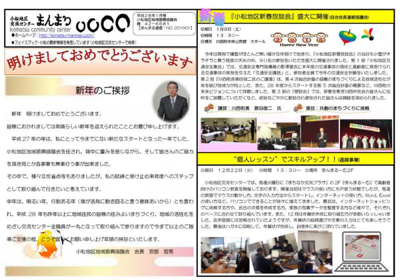 『月刊まんまる通信1月号』アップいたしました。』毎月リアルな地域の情報を全戸に配布しています「月刊まんまる通信1月号」をホームページにアップいたしました。今月の元気な小松は・・■館報〜まんまる通信1月号(表面)◆新年のご挨拶(小松地区交流センター会長)◆『小松地区新春放談会』盛大に開催(自治会長連絡協議会)◆”個人レッスン”でスキルアップ!!(過疎事業)■館報〜まんまる通信1月号(裏面)◆『食育ミュージカル・豆料理講習会・農都交流』(過疎事業)◆「備えあれば憂いなし」災害時の備えは大丈夫ですか!!(地域情報)◆真新しい”しめ飾り”で〜新春をお迎え・・・(地域情報)◆いい年を迎えんべぇ〜なぁ〜!!”門松”づくり(地域情報)◆今月の予定(1月〜2月)★★『月刊まんまる通信1月号』の詳細はこちらから★★★★小松の旬な話題は「小松地区交流センター」で検索★★★Facebook★小松地区交流センター★youtube