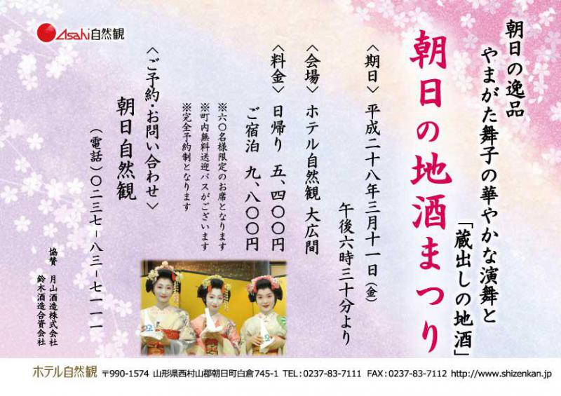 恒例となりました「朝日の地酒まつり」を開催いたします。「銀嶺月山」や「豊龍」の酒蔵として知られる江戸期創業の歴史ある鈴木酒造で丁寧に造られた蔵出しの地酒を思う存分ご堪能ください。このイベントでしか味わえない限定酒をご用意いたしました。また、山形の歴史ある伝統芸能を伝承している山形舞妓の演舞や、日本酒に合わせた酒の肴をご用意いたしております。◇日時 平成28年3月11日(金) 午後6:30から...◇場所 ホテル自然観 大広間◇料金 宿泊9,800円 日帰り5,400円※定員(60名様)になりしだい受付を終了いたしますので、お早めにお申込みください。申し込み先 Asahi自然観 0237-83-7111