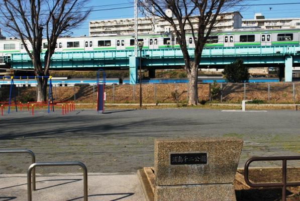 浦島第二公園京急車庫の通りを進み京急子安駅に近いところまで行くと浦島第二公園がある。公園からみえる横浜線は高架線になっていてその先に見えるのは今の県営浦島ヶ丘ハイツになる。昔は昭和の古い団地という感じだったが、今は高級なマンションに見える、丘の上で見晴らしがよく横浜の花火も見えるところである。