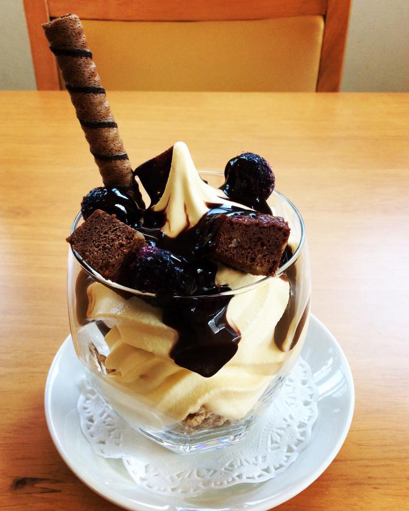 当店でも人気の高いスイーツ「トライフル」をリニューアルしました。今まではシフォンケーキをを小さく切ってトッピングしてましたが、この度、カカオマスが効いたビターなチョコブラウニーに変更。濃厚なバニラのソフトクリームにほろ苦いブラウニーは予想以上にベストマッチング!是非一度食べてみてください(*^_^*)!!トライフル(単品)・・・¥580ドリンクセット・・・¥900