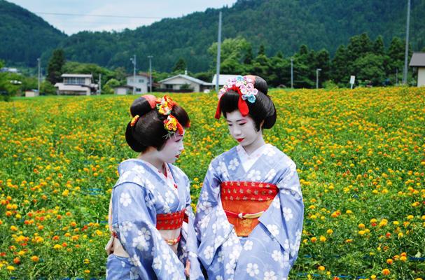 紅花まつりで舞妓さんの撮影会、ポーズに、目線に、笑顔の要求、踊りのしぐさも要求され舞妓さんも暑いのに大変、自分はしぐさの途中でみせる素の笑顔が好きだ、目線も外したときの色気とかがまたいいな・・・しかし紅花の転倒防止がビニールなのがちと残念だ。