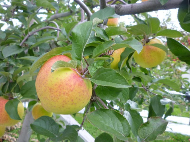 黄色地に赤みが入る綺麗なりんごです。Boys,be ambitious !「少年よ、大志を抱け」アンビシャスですね。小ぶりで実が締まって硬いのにい甘いのが特徴です。