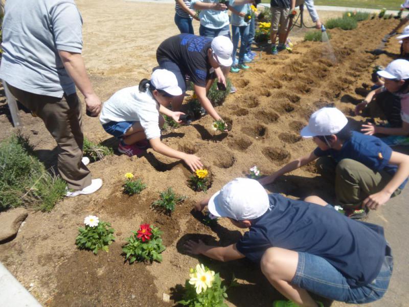 毎年の恒例行事で、朝日町の宮宿小学校6年生が和合荘へ花植えに来てくれました!雲一つない青空の下、元気いっぱいの子供たちが上手に花を植えました。入居者の皆さんも、子供たちと一緒に楽しく参加しましたよ。植えられた花を見て「きれいだな〜」「じょうずだね〜」との声が聞こえてきました。