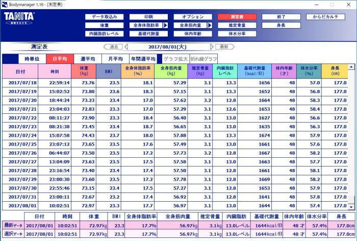 今日までのヘルスメーターです。最近は72s台に突入する日も出てきました。これで安定していけたらいいなぁ。これでもヘモグロビンはなかなか減りません。医者での血液検査では、 2/27 HbA1c 7.0 78.6s 3/27 HbA1c 7.1 77.8s 4/25 HbA1c 7.0 77.6s 5/25 HbA1c 6.8 75.4s 6/26 HbA1c 6.8 74.6s です。7/31血液検査 体重72.6sだったので今月の通院日に結果が分かります。下がってたらいいな。 目標は5.8です。