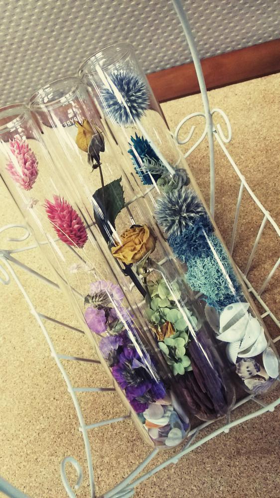 試験管ボトルにドライフラワーのお花を詰めました。色違いでかわいい☆☆☆