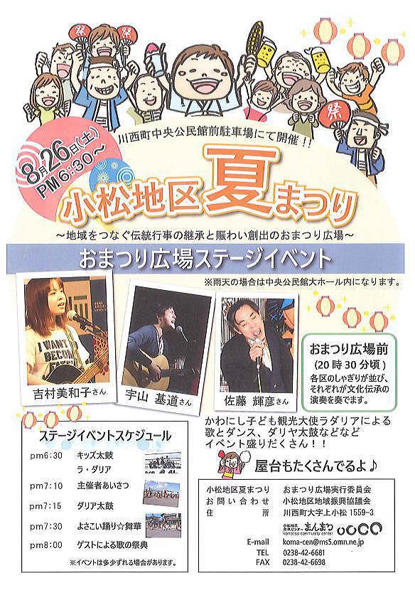 わっしょい!!わっしょい!!祭りだわっしょい!!小松の夏は「おまつり広場」で盛り上がろう!!【小松地区夏まつり】●期 日 8月26日(土)●場 所 川西町中央公民館前広場(役場前駐車場)...●時 間 午後6時30分〜(ステージイベント開始)〜地域をつなぐ伝統行事の継承と賑わい創出のおまつり広場〜”小松の夏はおまつり広場”での合言葉の中で、8月26日(土)に「小松地区夏まつり」が開催されます。このおまつりは、上小松諏訪神社例大祭に合わせて毎年行われているもので、今年は地域で活躍するアマチュアシンガーやよさこい、キッズ太鼓、ラ・ダリア等のステージイベントと、美味しさ、楽しさ満載の露店で会場を盛り上げます。◆雨天決行(雨天の場合は中央公民館大ホールで開催)また、8時30分頃には広場へ各地区「しゃぎり」が立ち寄り、文化伝承の魅惑の音色を奏でます。夏の夜長に、夕涼みをかねてご家族お誘い合わせの上是非お出でください。
