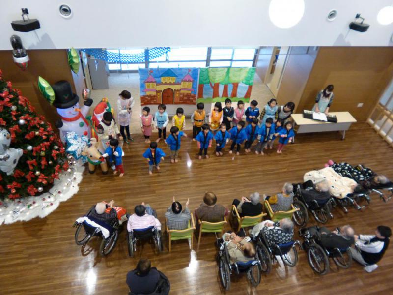 山形市にあるセロン北保育園の子供たちがきてくれました!施設内に子供たちの声が聞こえてくると、いつも落ち着かれている入居者さんの雰囲気がわくわくそわそわした様子に変わりました。保育園のお遊戯会で発表した歌や劇などを披露してくれると聞き、とても楽しみにしていました。元気な挨拶から始まったお遊戯披露の1番目はお歌です。大きな声で「サンタが街にやってくる」などのクリスマスソングを歌ってくれました。2番目は元気に踊るダンスと、ソーラン節でした。ソーラン節に驚きましたがとっても上手で、入居者さんも一緒に歌う方や手拍子をする方が見られました。3番目は「金のガチョウ」という劇でした。保育園用に簡単にされた内容ですが、貧しい少年が善行によりお姫様と結婚して幸せになるというお話です。衣装に着替えて、役になりきり台詞を話す様子はとても堂に入っていて、見ていてとても面白く観劇できました。最後に、素敵なプレゼントをいただきました!色とりどりの毛糸で作ったハートのリースです。面会に来たご家族様も見れるように、事務室にさっそく飾りました。お昼には、クリスマスツリーの前でお弁当を広げて賑やかにご飯を食べていましたよ。セロン北保育園の皆さん、先生方とても素敵な時間をありがとうございました。