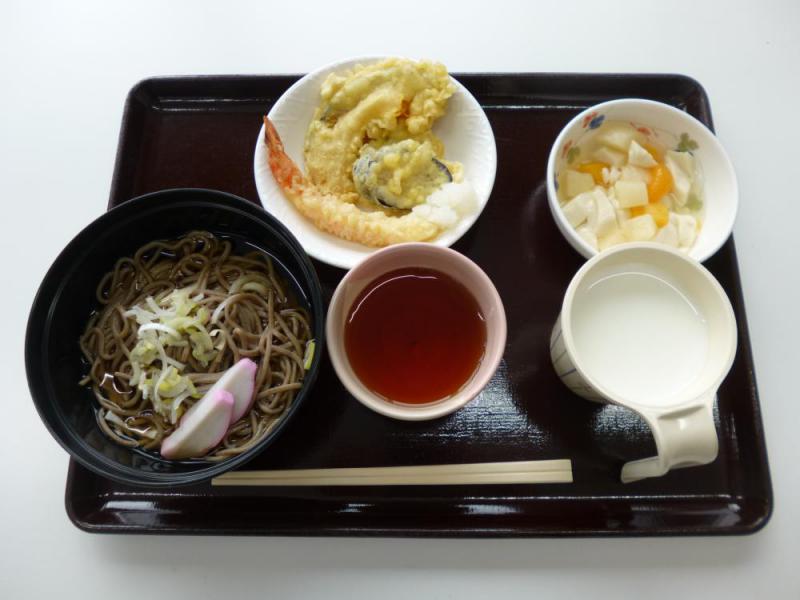 年の暮れになりましたね。さて、一般的に大晦日の年が明ける前に食べる年越しそばですが、和合荘では、少し早い年越しそばを昼食にご用意しました。本日のメニューは、かけそば、別皿に天ぷら(揚げたて!)、デザートにフルーツポンチです。天ぷらは、海老天・南瓜・茄子をご用意しました。衣はサクサクで、とてもおいしい天ぷらでした。少し早い年越しの暖かい天ぷらそばに皆さん喜ばれていました!