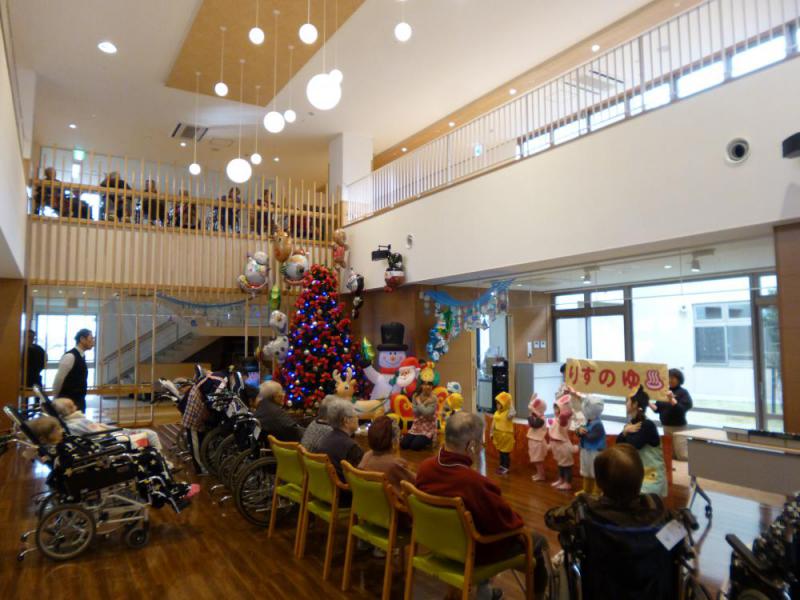 朝日町の隣、大江町からわかば保育園の子供たちが和合荘に来てくれました。昨年もとっても素敵な歌やダンスを披露してくださった保育園の子供たちの来荘に、皆さんとても楽しみにしていました。最初は、2歳の子供たちによるお遊戯です。動物たちに扮した子供たちがとてもかわいらしく、見ている入居者さんはニコニコ笑顔です。その後は、クレヨンに扮した子供たちによるお歌や、男の子だけで元気に格好よく踊ったり、女の子だけでアイドルになりきって可愛く踊ったりと、たくさん披露してくれました。一番年長さんの和太鼓演奏は、迫力満点!ドンッドドンッと1階から2階までホール中に響きました。最後は、全員で合唱です。おじいちゃんおばあちゃんのために「ふるさと」を練習してきたと聞きびっくり!知っている方は一緒に歌いましょうとのお誘いに、入居者の皆さんも一緒に歌いました。子供達の息の合ったダンスやお歌の披露に、入居者の皆さんも職員も笑顔で楽しみました。わかば保育園の皆さん、先生方とても楽しい時間をありがとうございました。