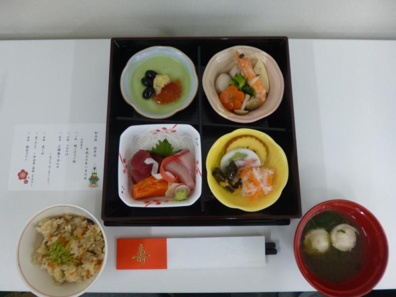 明けましておめでとうございます。今年もよろしくお願い申し上げます。さて、新たな年を迎えた和合荘ですが、1月は様々な行事があります。その中でも、お正月料理にPickUpしたいと思います!和合荘では毎年新年会を開催し、お祝いいたします。そこで、入居者さんが楽しみにしているのはやっぱりお食事です。今回も、お正月らしい品々をご用意いたしました。おせち料理の意味は有名なので知っている方も多いでしょうが、和合荘で提供されたお料理を紹介しながら、意味や由来を載せたいと思いますのでお付き合いお願いいたします。実際のおせちは、たたきごぼうですが、入居者さんが食べやすいように混ぜご飯となっています。ごぼうは、「家(家族、家業など)がその土地にどっしりと根を張って安泰に」と願いが込められています。成長と共に名前が変わる出世魚であることにあやかって出世を願って食べられます。根菜を中心に野菜などを一緒に煮た煮しめには「家族仲良く一緒に結ばれる」という意味があるそうです。また、具材それぞれにも意味があるようですよ!たとえば、椎茸は「元気・壮健」への願い、海老はその姿にたとえて「腰が曲がるまで長生きするように」と長寿の願いだったり・・・。文化の発展や、学問・習い事の成就を願う食べ物です。紅白だと、赤は「魔除け」白は「清浄・神聖」をあらわし、紅白で縁起が良いともいわれます。紅白の色は水引をあらわしており「平安・平和」を願う縁起物です。この1年まめ(まじめ)に働きまめ(健康)に暮らせるようにと、邪気を払い「無病息災」を願った食べ物です。お住まいの地域によって様々な違いがあるかと思いますが、どの地域でもたくさんの願いが込められているのでしょうね。