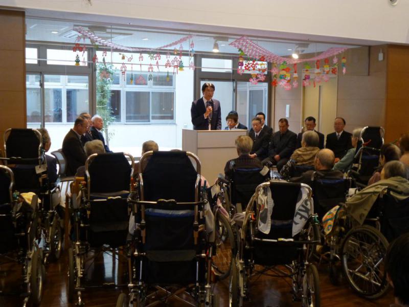 1月6日、和合荘新年会を開催しました。朝日町副町長、健康福祉課長をはじめ、和合地区の区長の皆様、お取引先の皆様を迎え、新年のお祝いしました。副町長からのご祝辞をいただいた後は、和合地区カラオケ愛好会の皆様による「歌謡ショー」の始まりです。お祝いの歌である『俵積み唄』から始まり、昭和の懐かしい歌謡曲が次々と続きます。最後は『真室川舟歌』を入居者の皆さんと合唱し、マイクを向けられた入居者さんは恥ずかしそうにしながらも気持ちよく歌っていました。皆さん手拍子を打ったり、口ずさんだりと思い思いに楽しまれており、中には「昔を思い出した。懐かしい」と涙を拭う方もおりました。「歌謡ショー」が終り、お楽しみの昼食になります!〜本日のお品書〜 ・ご飯:鶏ごぼうご飯 ・汁物:つみれ汁 ・刺身:三種盛り合わせ(まぐろ・サーモン・ぶり) ・煮物:煮しめ ・盛り合わせ:伊達巻・蒲鉾・なます ・甘味:抹茶プリン お正月らしい彩り豊かな豪華な献立になっております。入居者の皆さんからは、美味しい!と大好評で、特にお刺身はほとんどの入居者さんがペロッと食べておりましたよ。