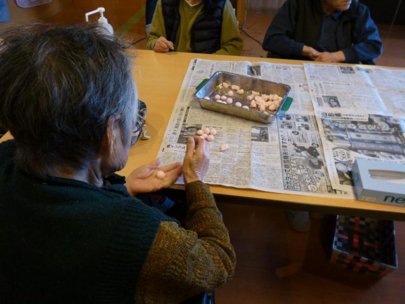 小正月(1/15)を前に、伝統行事である「だんご木」を作りました。(地域によって呼び名は様々あるようです。)当法人の理事よりいただいた「みずきの枝」も準備され、さっそく作業開始です!まずは、紅白のだんごを丸めます。皆さんとても上手にだんごを丸めてくださり「もっとないか?」と積極的にお手伝いしてくださいました。丸めただんごは、職員が茹でて粉をまぶします。次は入居者さんの協力のもと、紅白のだんごや船煎餅を枝につける作業です。 「ここでいいが?」  「紅白交互につけねど」  「見てけろ!どうだ?」皆さん会話が弾んでいるようです。最後は、柱に括り付けて完成です!赤いミズキの枝先の紅白だんごや下がる船煎餅がとても華やかです。 小正月行事のだんご木は「豊作祈願」「一家繁栄」「豊かな生活」などを祈願して行います。和合荘で過ごされる入居者の皆さんが、実りある豊かな生活を送られるように願いを込めて・・・。