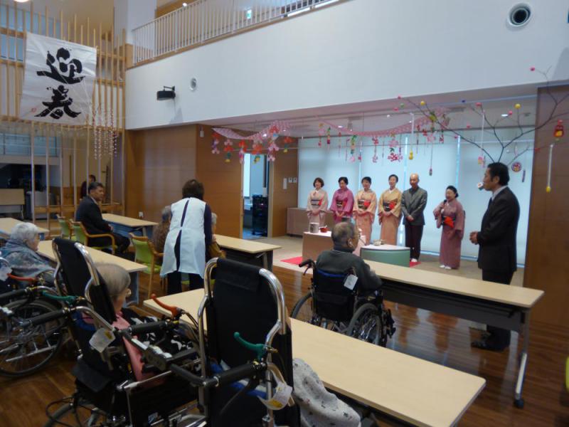 新年のお茶会を1階の交流ホールで開催しました。昨年もお越し頂きました、登坂宗邦社中の皆様によるお点前を頂戴しました。着物姿の皆様が、御抹茶と上生菓子をお一人お一人の前にお運びいただき、入居者の皆さんもお辞儀をして受け取る姿が印象的でした。1年に1度の御抹茶に皆さん美味しいと大好評で、「もう一服!」とお代わりをされる入居者さんも見られましたよ。職員も一緒にいただき、甘い上生菓子とほろ苦い御抹茶を堪能させていただきました。また、朝日町長も見えられお手前を頂き大変喜ばれておりました。登坂宗邦社中の皆様、お忙しい中来荘くださった朝日町長、ありがとうございました。※上生菓子は「千両」:冬に赤い実をつける縁起の良い植物。