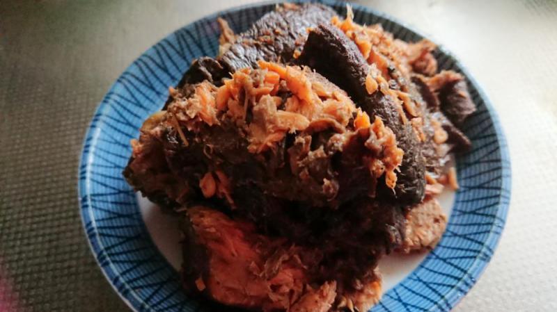 本日の煮物は・・・・・「鮭とあけび干しの煮物」です(^。^)v秋に天日干しした「あけび」を冬の寒い時期に食べる保存食です。苦みがあり大人の煮物です。