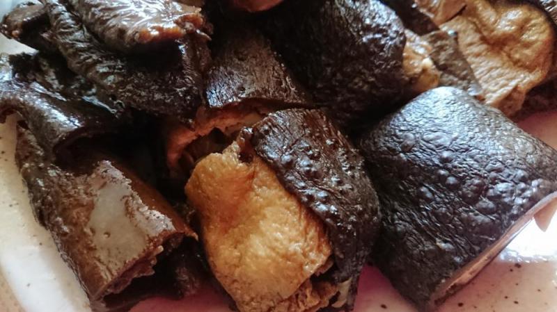 今日は、彼岸明け美蔵の近辺では今日がお墓参りです。今年は雪が多くてまだ 残っているようでお墓参りに行かれる方も少ないです。今日の御彼岸のお帰りには・・・・・ご先祖様が舟に乗り 無事帰れるようにと【あけび】の煮物をお供えいたします。なのねで母があけびの干しに牛蒡・油揚げ・さつま揚げをくるんで作っておりました(^。^)v