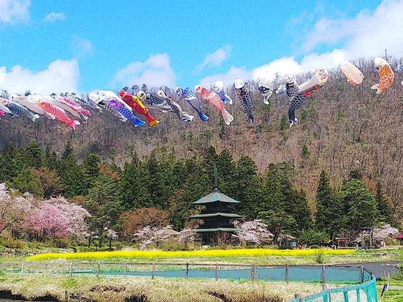 高畠町の桜が見頃を迎えました!!画像は「安久津八幡神社の桜」です(^_^)こいのぼりも泳ぎ始めました。みなさまぜひ高畠にお越しください。