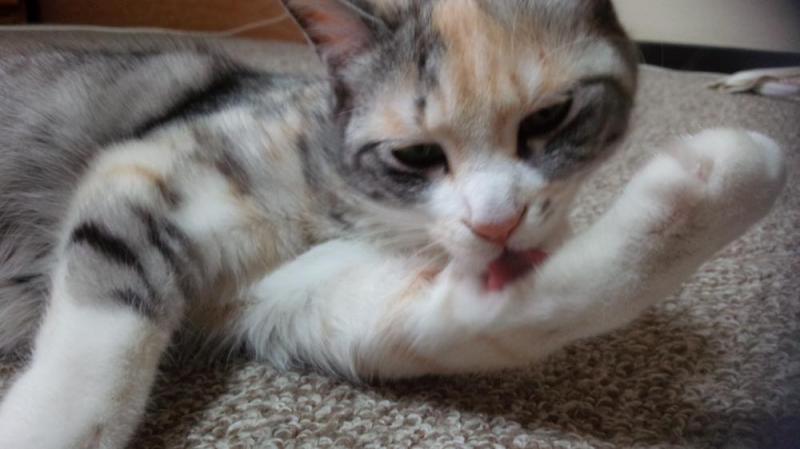 どたーっと横になり、毛繕いをはじめたにこちゃん、まずは、おててから!ぺろーん。リラックスモードの後お昼寝となりました。