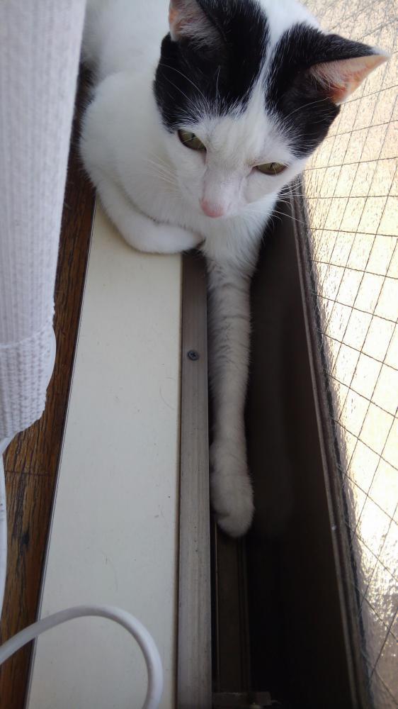 細長い手をはめ込み日向ぼっこ中。サッシは猫のための隙間なんだね。by バンビーノ