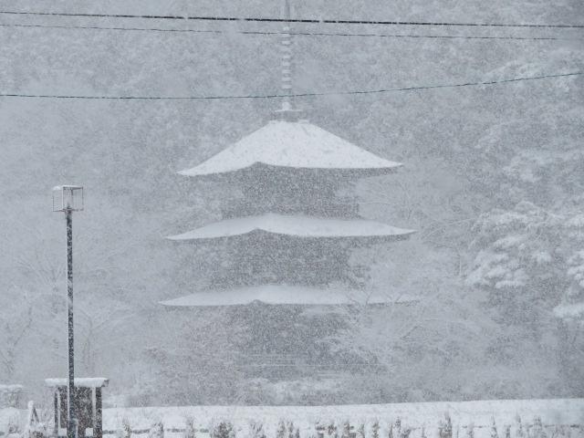 安久津八幡神社の三重塔も真っ白に雪化粧しました。