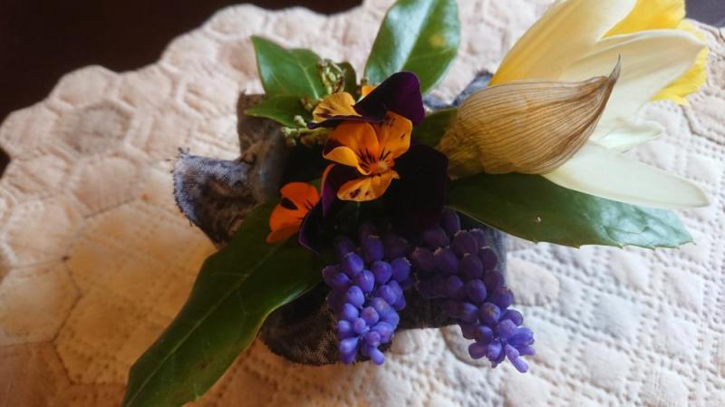 今日は、窓辺と・テーブルの花は【水仙・ムスカリ・ビオラ】です。今 水仙が満開です。桜は 咲き始めです~