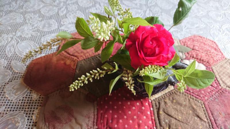 今日のテーブルの花は【りょぶ・真っ赤ばら】です。真っ赤なばらは、今 見ごろの庭のばらの花です。本日は、定休日ですが予約のみの営業しております。
